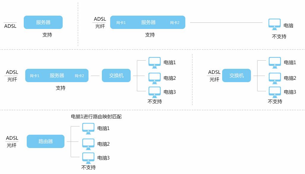 第一种情况,服务器电脑直接通过ADSL或者光纤直接上公网。这种情况,直接使用。